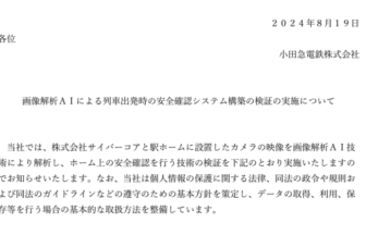 小田急電鉄株式会社は2024年8月19日、新百合ヶ丘駅にて、人工知能と画像解析技術を組み合わせた、AIによる列車発車前の安全確…