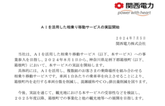 関西電力株式会社は2024年7月5日、乗り合い型の移動サービス参入を目指し、人工知能を取り入れた移動サービス「カンモビMove…