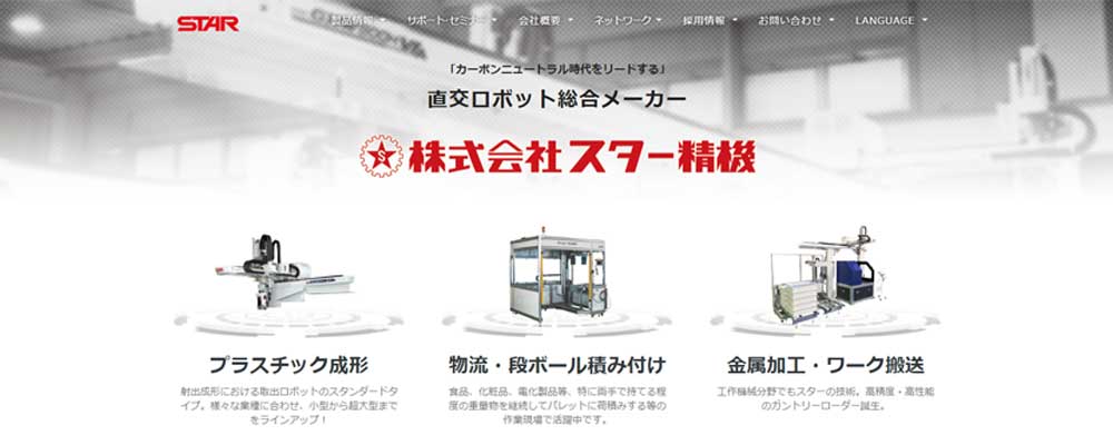 株式会社スター精機は、産業用ロボットの開発から保守点検まで行っている企業です。同社が取り扱うロボットパレタイザーの「PXT/PXWシリーズ」は、ロボットの動線が一定方向であるため、狭いスペースでも荷物の搬送を実現できます。