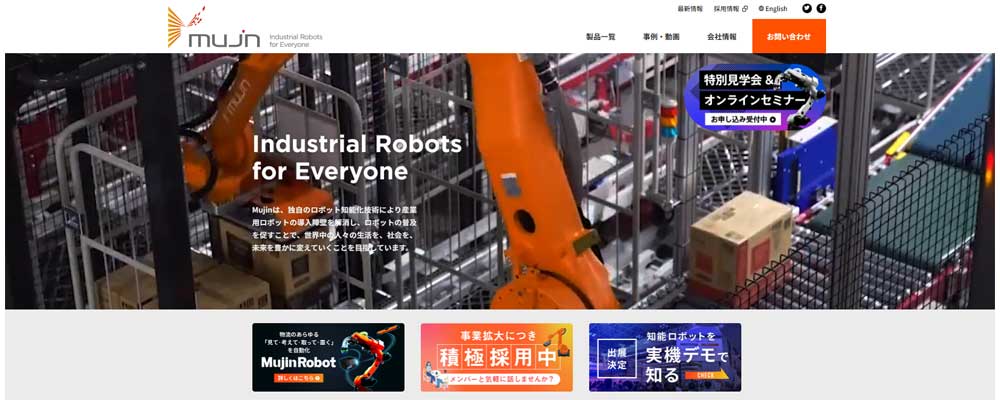 株式会社Mujinは、「すべての人に産業用ロボットを」をタグラインにロボット開発事業を手がけている企業です。同社のパレタイズロボットの「物流自動化ロボット」は混載の積み付けに対して、1時間あたり最高500ケースを搬送できる高い能力を誇っています。