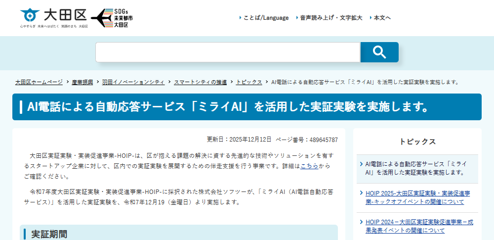 大田区は2025年12月12日、AI電話による自動応答サービス「ミライAI」を活用した実証実験の実施を発表しました。