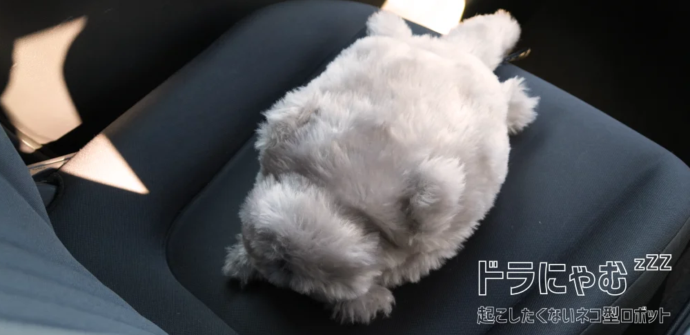 「ドラにゃむ」とは、心理的な働きかけによって安全意識の向上を図る新しいアプローチとして、守りたくなる存在が同乗している感覚を生み出すことを狙った猫型ロボットです。通常時は寝息を立てて眠っていますが、急操作などリスクのある運転を感知すると目を覚まして鳴き声を発する仕組みを持っています。起こしたくない存在が反応することで、ドライバーに間接的な気づきを与え、丁寧な運転を促す設計です。