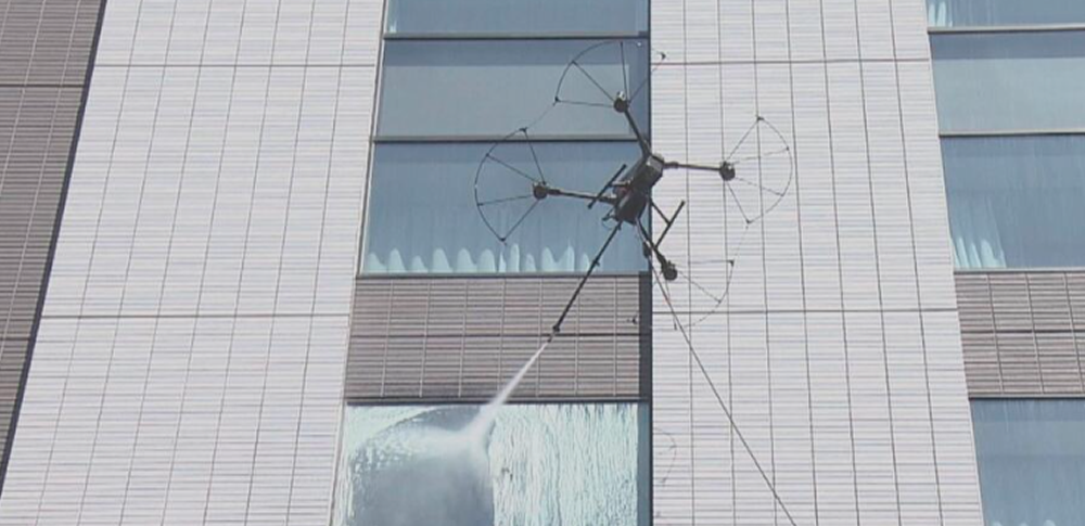 同社によると実証実験は、高圧洗浄ノズルを備えたドローンがビルの窓付近に滞空し、放水による窓洗浄を行うという内容です。実験現場となったのは広島市南区のホテルグランヴィア広島サウスゲートで、地上約70メートルの15階や90メートルの21階に接近。ビルに付着した鳥のフンなどに放水し、洗浄する様子が確認されました。