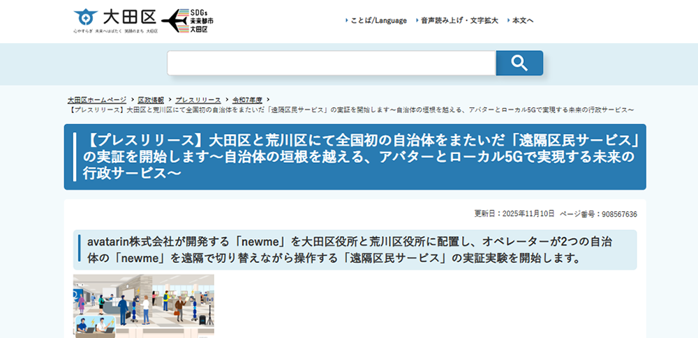 参照【プレスリリース】大田区と荒川区にて全国初の自治体をまたいだ「遠隔区民サービス」の実証を開始します~自治体の垣根を越える、アバターとローカル5Gで実現する未来の行政サービス~|大田区